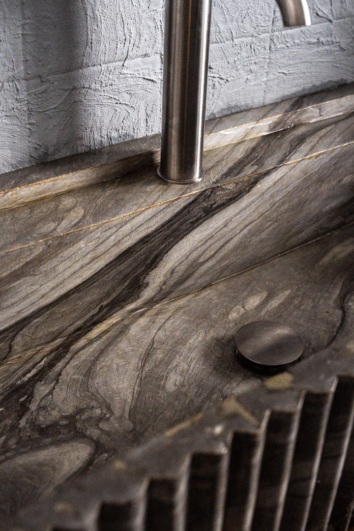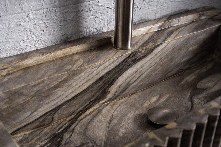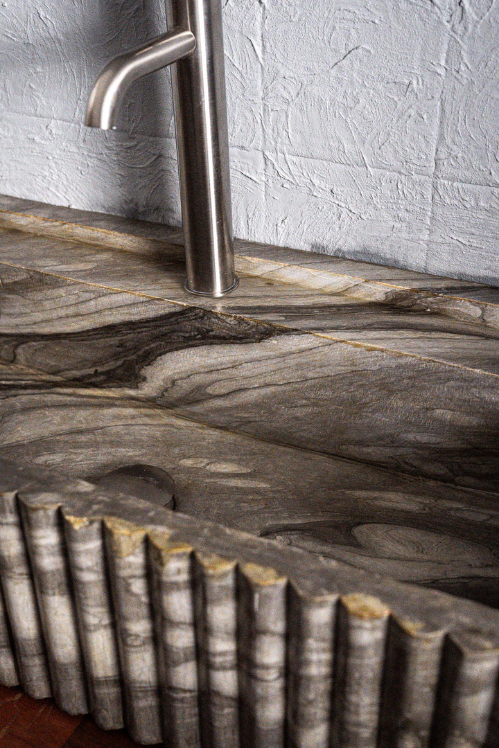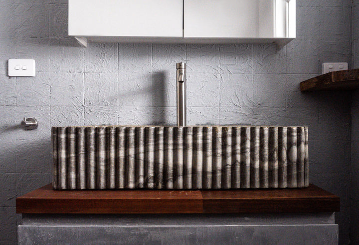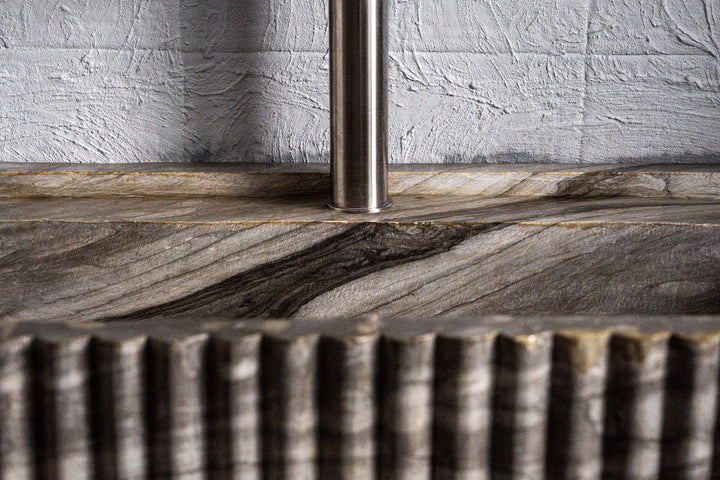 Refined yet grounded, the Lunara Fluted Basin transforms Himalayan quartzite into a work of architectural sculpture. Carved into an elongated rectangular form and adorned with hand-cut vertical fluting, this basin celebrates symmetry, shadow, and stone in perfect harmony.