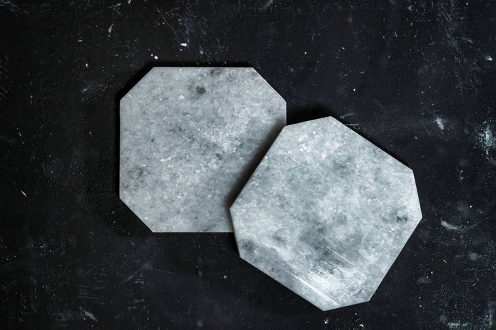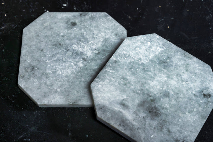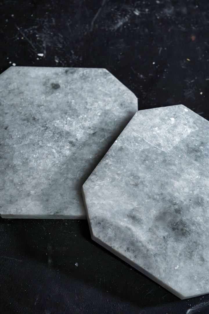 Set in a precise flat lay format, Crystalline Lay honours symmetry and simplicity, allowing the natural variations — soft mineral veining and tonal depth — to take centre stage. The effect is both composed and alive: a canvas of stillness, textured by time.