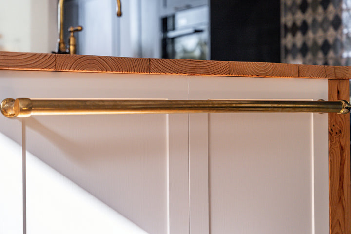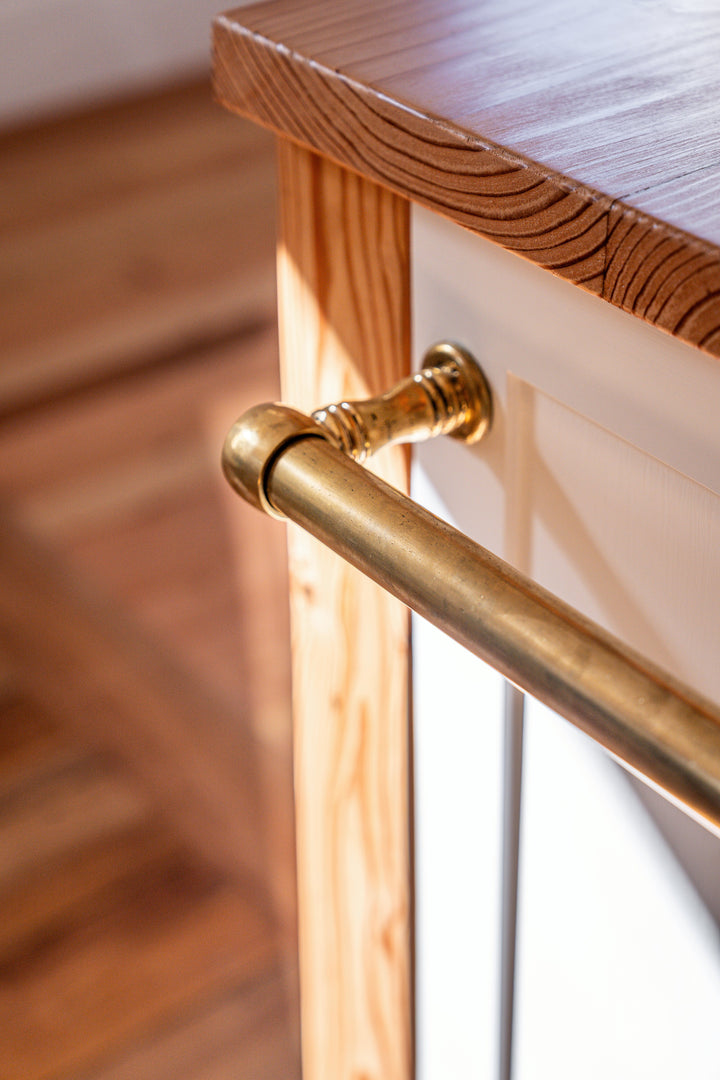 The rail itself is formed from a refined tubular profile, allowing for a clean, floating presence, while the brass standoffs bring warmth, integrity, and a grounded beauty to your space.